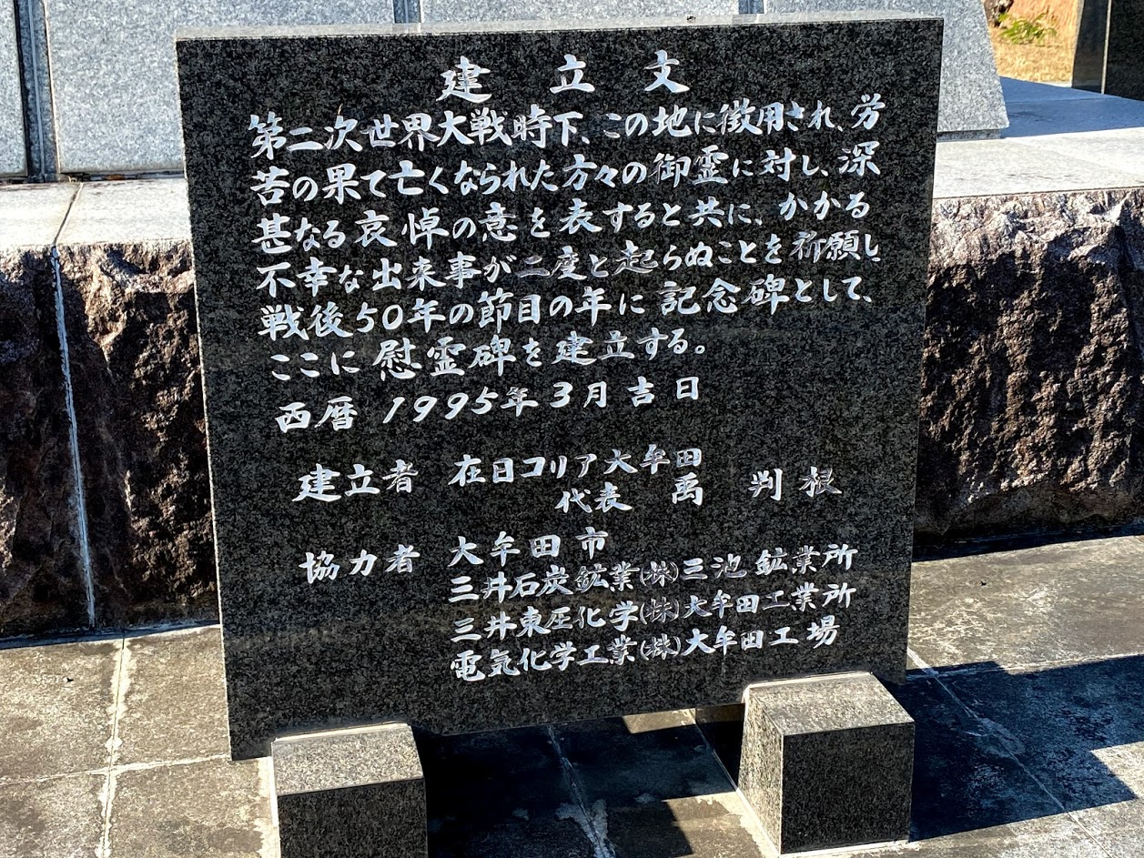 우 씨는 원통함을 풀어야 한다는 생각에 위령비 건립을 계획하게 되었다. 미츠이 회사 측과의 5년에 걸친 교섭 끝에, 1995년에 오무타 시가 무상 제공한 공원 내 부지에 진혼을 위한 비석을 건립했다. 우 씨는 "미츠이와 오무타 시, 자이니치라는 3자가 함께 이름을 올려 세운 비석이라는 점이 돌아가신 영에 대한 위로가 될 것"이라며 소회를 밝혔다. 2022년 6월에는 징용공이 예전에 살았던 시내 탄광주택 터에 위령의 말을 새긴 비석을 세웠다.